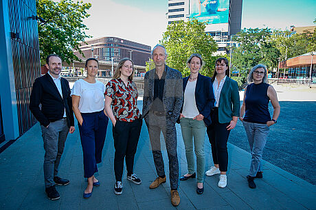 Thomas Harling (Mitte) übernimmt zum 1. Oktober 2023 die Leitung der Katholischen Akademie in Hannover. Ihm zur Seite stehen Dr. Andreas Reitinger, Margit Pfeifer, Frieda Philine Himstedt, seine Stellvertreterin Dr. Annette Schmidt-Klügmann, Ines Schnecker und Anita Rzesacz (von links).