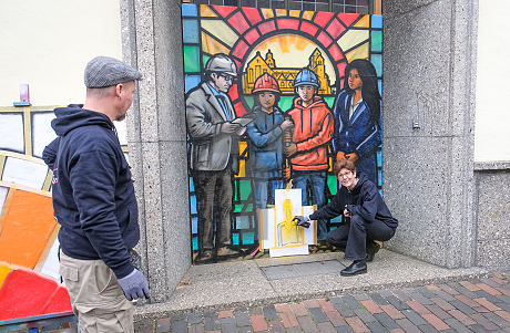 Bei der Kunst-Aktion zum offiziellen Start des umfangreichen Bauvorhabens am Gymnasium Mariano-Josephinum hat auch Katrin Gladen (Leiterin Abteilung Schule und Hochschule) unter den wachsamen Augen von Künstler Ole Görges zur Spraydose gegriffen.